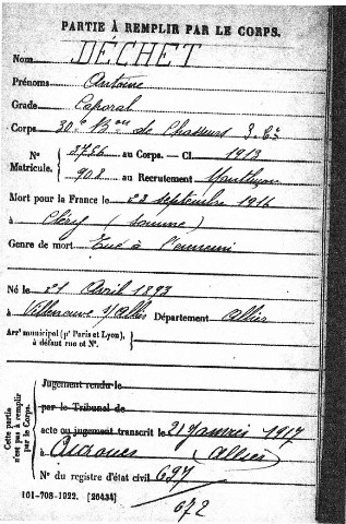 De nombreuses familles (beaucoup trop) ont souffert de la perte d'un des leurs pendant la Première GUERRE MONDIALE Pour notre part, 2 personnes, l'un de la branche LARONDE et l'autre de la branche RONDEAU, ont disparu à cette époque Antoine DECHET et Edmond RONDEAU Nous avions des renseignements sur Antoine DECHET puisque d'une part des informations nous avaient été transmises oralement et d'autre part les inscriptions sur sa sépulture au cimetière d'AUROUËR (ALLIER) confirmaient celles-ci. ![]()