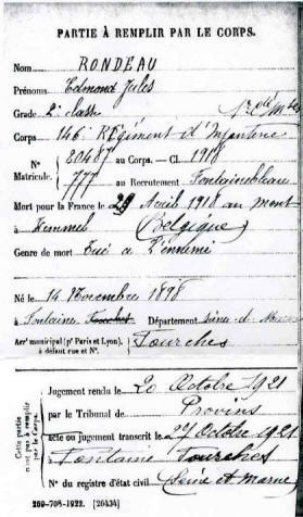 Par contre nous n'avions aucun renseignement sur Edmond RONDEAU hormis le fait que son nom soit gravé sur le MONUMENT AUX MORTS de FONTAINE-FOURCHES (Seine et Marne). ![]()